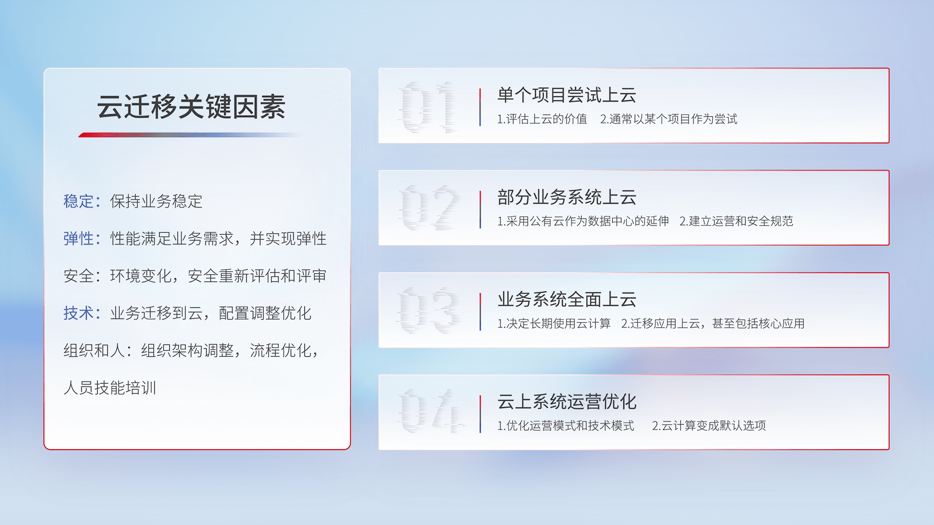 结合实际业务,,从规划设计、、、、云平台选型、、云原生改造、、、、数据迁移、、、、集成交付,,迁移全过程为客户识别最佳上云路径,,,,做好风险识别管理,,,,设计网络架构、、、、身份权限、、、、安全审计合规、、、、操作审计、、、、日志审计、、、监控告警策略、、多站点容灾设计等,,,,对云上基础设施进行整体规划,,,提升IT治理水平,,,,以满足弹性、、、、高可用、、高性能的需求。。。。