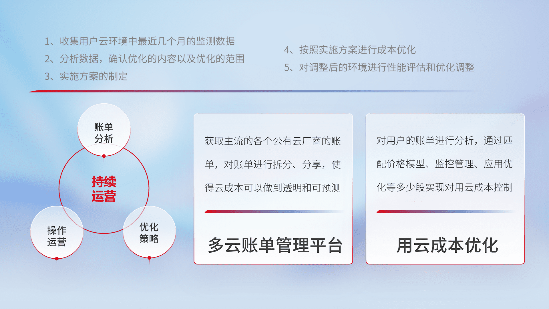 通过多云纳管,,,以统一的资源数据模型把客户的云资源进行抽象和封装,,,,进而实现对多云资源的统一操作,,,保障云资源管理的可靠性、、、、稳定性与可用性。。。量身定制化运维内容,,,配置、、、开发运维、、、补丁管理、、、备份、、、监控、、认证和访问管理、、、审计和日常巡检等,,保障在用云过程中的可靠度,,,,稳定度以及高可用率。。。